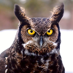 The great horned owl (Bubo virginianus), also known as the tiger owl (originally derived from early naturalists' description as the "winged tiger" or "tiger of the air") or the hoot owl, is a large owl native to the Americas. It is an extremely adaptable bird with a vast range and is the most widely distributed true owl in the Americas. Its primary diet appears to be rabbits and hares, rats and mice and voles, although it freely hunts any animal it can overtake, primarily other rodents and small mammals, but also larger mid-sized mammals, various birds, reptiles, amphibians and invertebrates. In ornithological study, the great horned owl is often compared to the Eurasian eagle-owl (Bubo bubo), a closely related species which, despite the latter's notably larger size, occupies the same ecological niche in Eurasia, and the red-tailed hawk (Buteo jamaicensis), with which it often shares similar habitat, prey and nesting habits by day and is thus something of a diurnal ecological equivalent. The great horned owl is one of the earliest nesting birds in North America, often laying eggs weeks or even months before other raptorial birds.